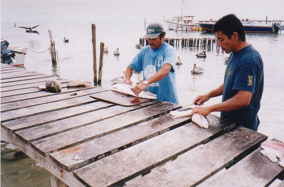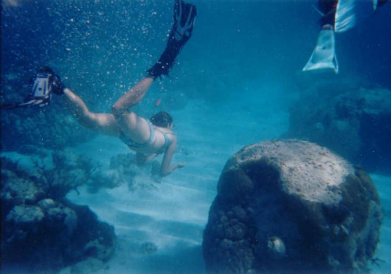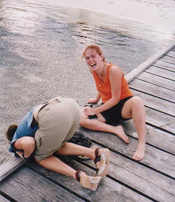 8 februari (JB) We hebben twee kleine Nurse sharks gezien en Okka en Jannes een grote. Ik denk dat ik Green fingersponge heb gezien, Lotrochota birotulata en Sea pearl, Ventricaria ventricosa, Chlorophyta. De kupjes op steeltjes die we onder pieren hebben gezien zijn Green mermaids wine glass, Acetabularia calyculus. Ook giant anemone, Condylactis gigantea, Actiniaria. Harlequin bass, Serranus tigrinus en Hermit crab, Coenobita clypeatus en Heliotropium ternatum (plant). Vanmiddag is er 500 US dollar gestolen uit het kamp met studenten aan de andere kant van het eiland. De verdachte is direct aangepakt door Roger en Marciano. Roger had al een vermoeden, omdat hij de jongen die het gedaan had al een keer had betrapt op een poging tot stelen van zijn kamer. En Uray miste toen ook wat geld. Roger heeft nicknames voor ons bedacht: Loca voor Okka (gek) en Anus voor Jannes en Joegrin voor mij (melkman), maar Marciano noemt mij pancha. Roger zullen we maar Roger Rabbit noemen tot we iets beters hebben. Marciano noemen ze hier iets wat 'balls' betekent. De mensen op het eiland en de vissers in deze omgeving respecteren Marciano behoorlijk, waarschijnlijk ook omdat hij altijd visser is geweest. Zondag 9 februari