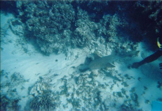 februari (JB) We hebben vanochtend een Reefshark, Carcharhinus perezi, van heel dichtbij gezien. Verder vervelend veel Barracuda's en ook veel Queen triggerfish. Hele mooie grote Ocean triggerfish gezien, Canthidermis sufflamen. Gisteren tijdens het kreeftvissen een Spotted drum gezien, Equetus punctatus, zwart wit gestreept en op het achterlijf zwart met witte stippen. Een paar dagen geleden heb ik dus een Sand diver aan de haak geslagen, Synodus intermedius. Er zijn zoveel algensoorten op het rif. Een mooi voorbeeld is Small-leaf hanging vine, Halimeda goreaui, Chlorophyta. Volgens mij heb ik ook al vaak Golfball coral gezien, Favia fragarum. Donderdag